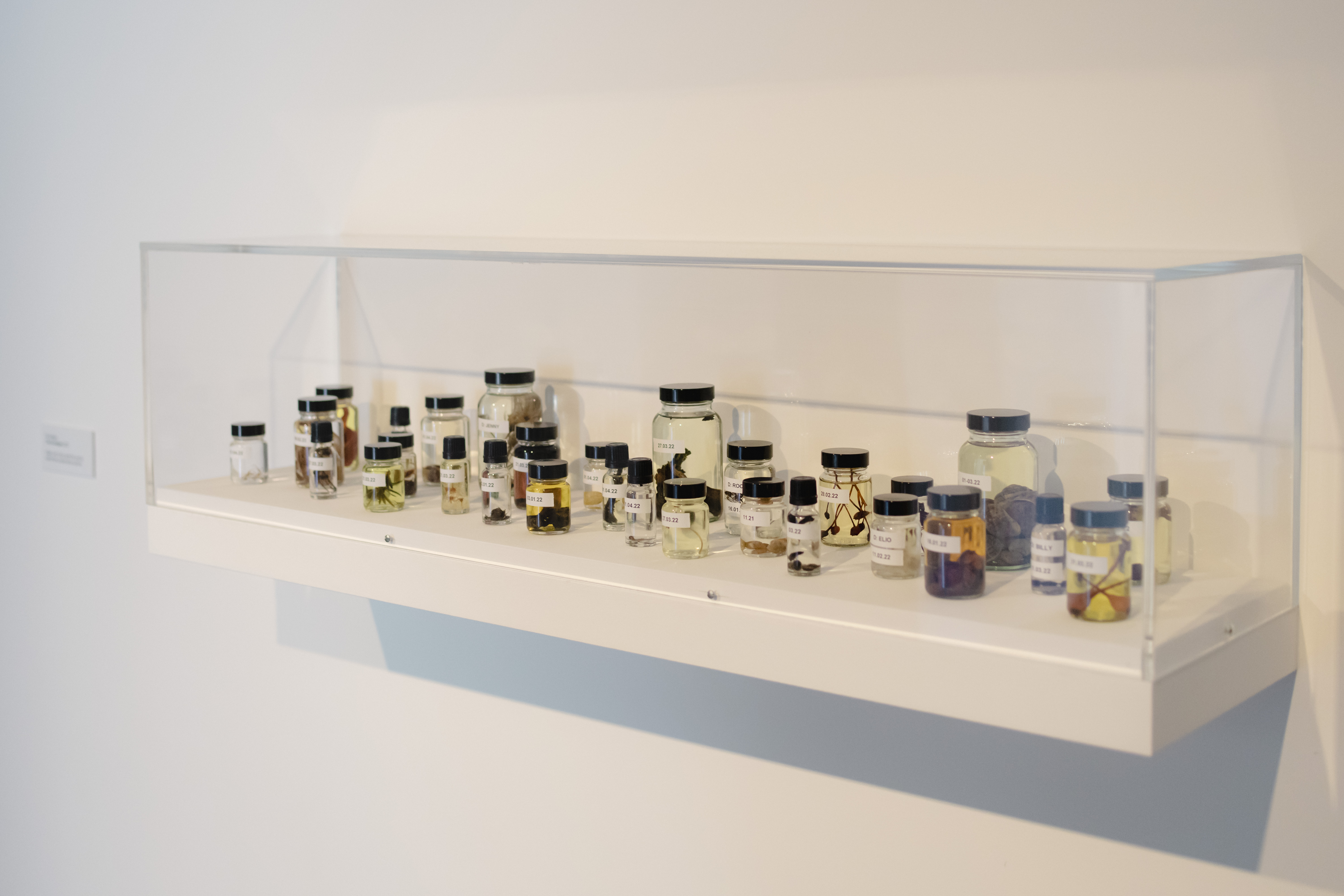 Image Credit: Arlo Lawton[4 images at slightly different angles of about 30 clear glass bottles of a variety of sizes. The bottles have black caps are arranged on a white shelf in a rectangular glass vitrine that hangs on a white wall. Each bottle has a printed white label with a date, a few bottles have labels with names. Each is filled with liquid that ranges from clear to yellow or orange and different shaped natural materials; some delicate and spindly, some filling the bottom of the bottle.]