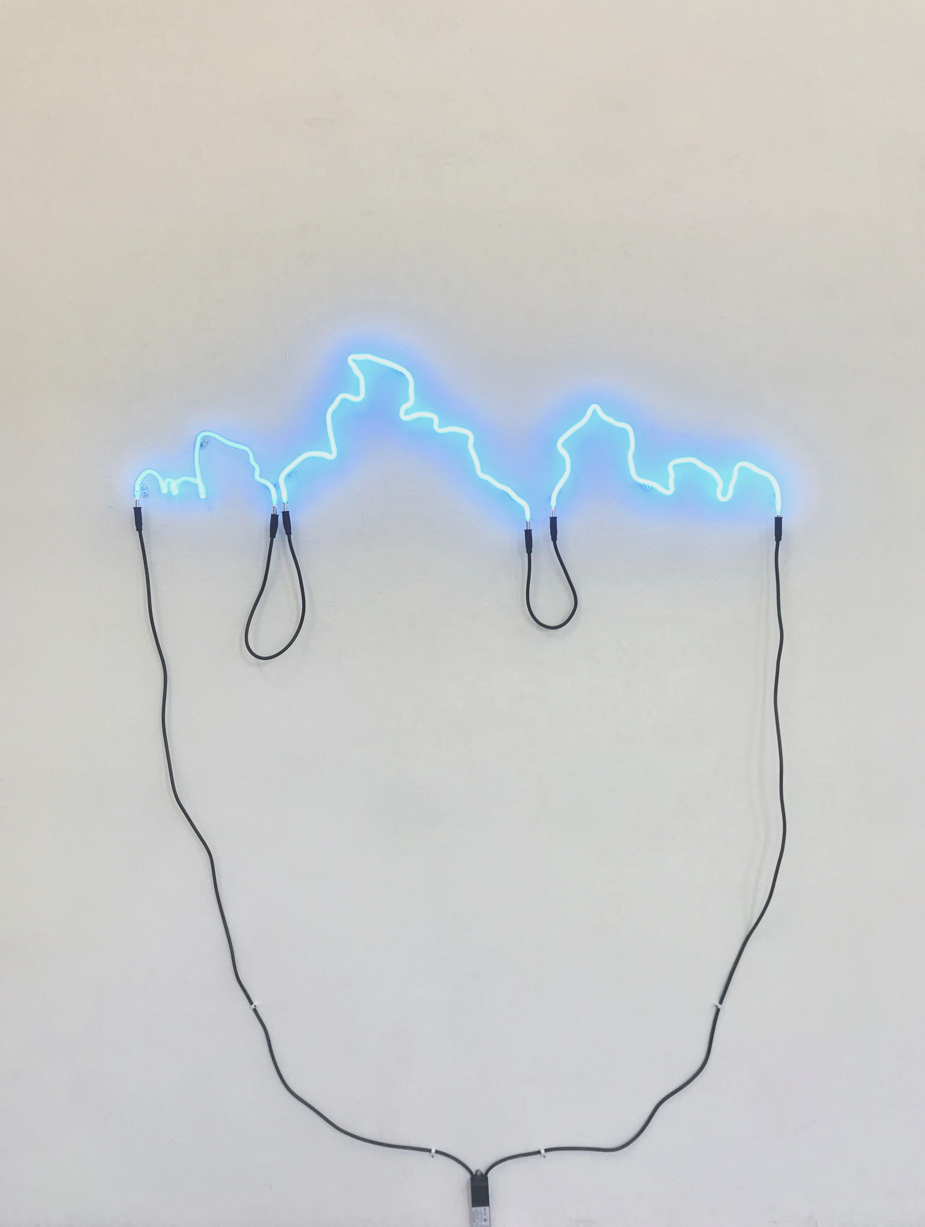[Three variable lengths of clear glass tubing filled with argon gas, bent in the silhouette of a rocky landscape are mounted to the wall in a brightly lit room. Two black cables joining the ends of the tubes together, drooping in the center down the wall. A single black cord on either side of the furthest tube ends, and hangs towards the floor, secured by white plastic cord mounts, and connected to a power supply at the bottom of the frame. The gas in the tubes is bright blue almost white, but they have a softer, pale-blue outer glow]613.5 x 446.5mm x 100mm.